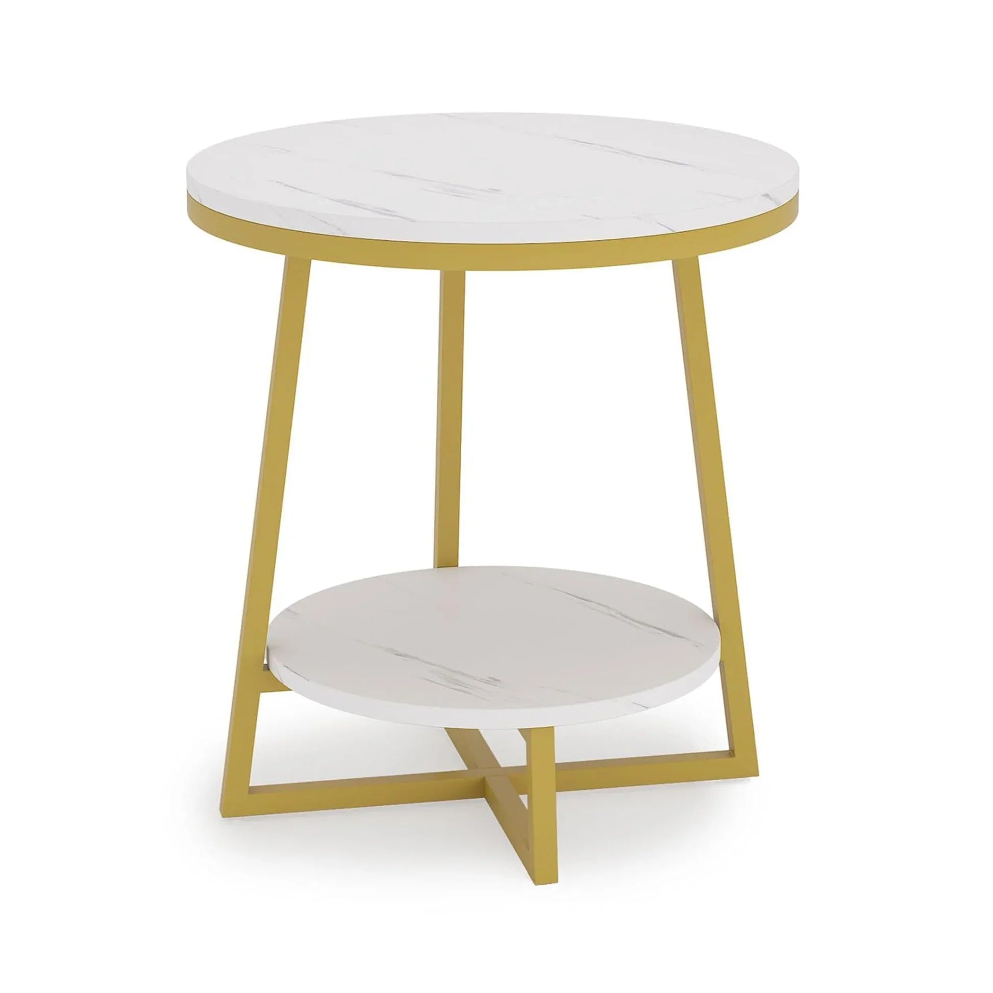 2 Tier Faux White Marble Side Table with with Golden Finish Storage Shelf