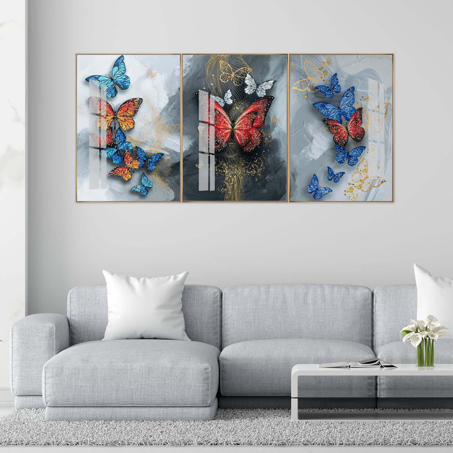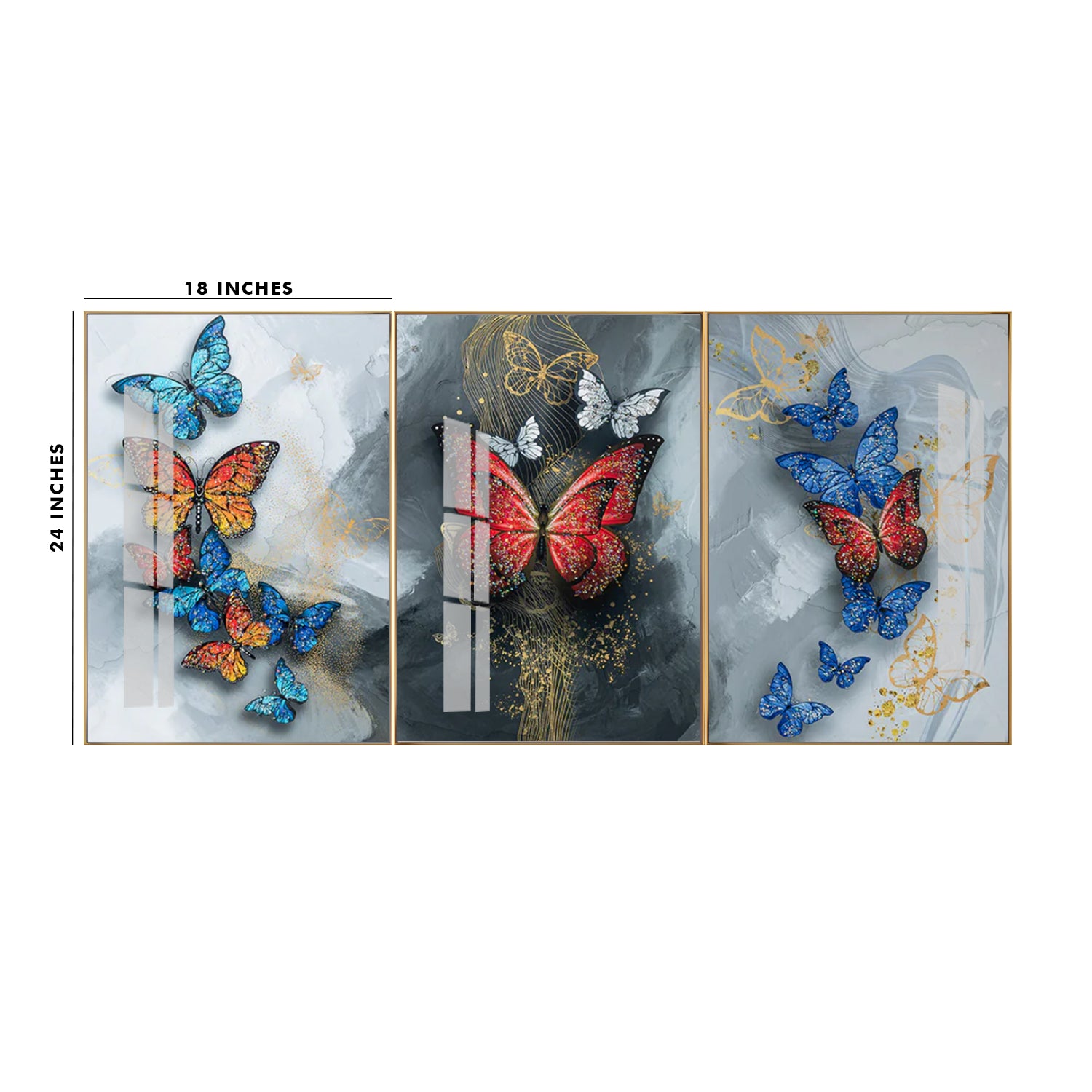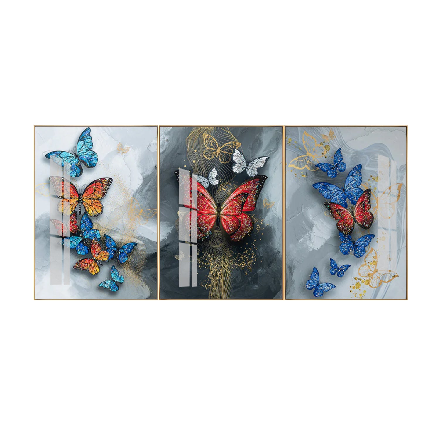 3-Panel Butterfly Wall Art: Colorful Butterflies on Grey & Gold Abstract | Modern Triptych