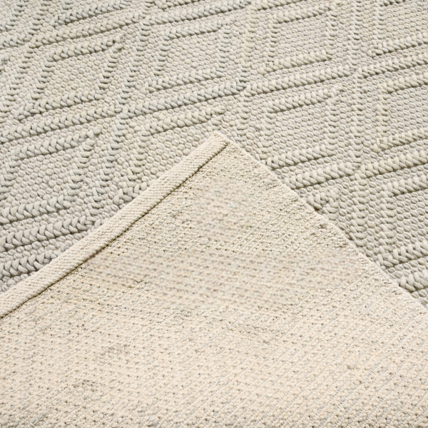 Alureva embodies understated sophistication with its soft diamond weave and subtle ivory tones. Hand-woven using New Zealand wool and cotton, it blends durability with elegance. The clean, rhythmic texture offers timeless appeal—perfect for serene interiors, minimal settings, or layering under curated decor.