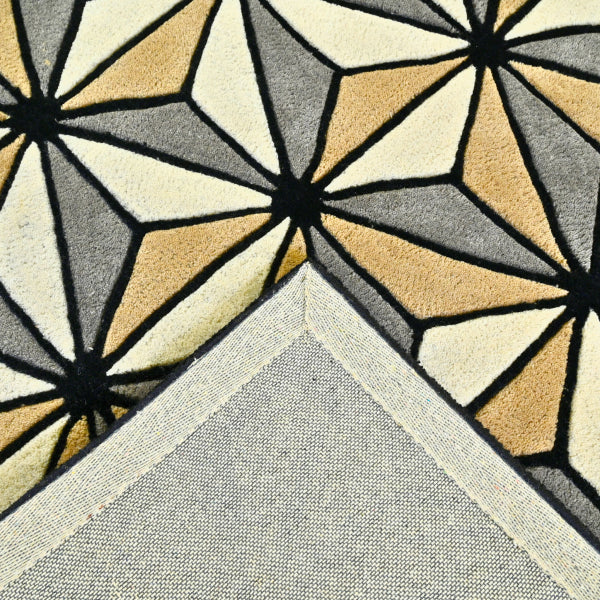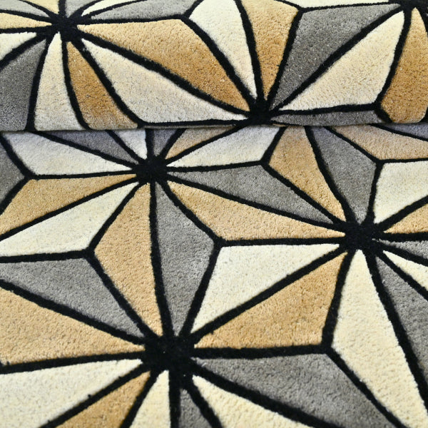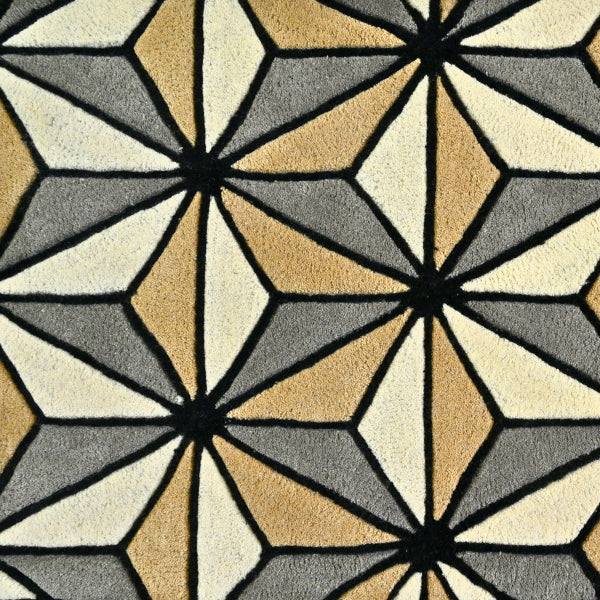 Azmira blends optical intrigue with elegant structure through a rhythmic lattice of faceted diamonds. Hand-tufted in plush New Zealand wool, the interplay of charcoal, stone grey, sand, and ivory tones creates a bold visual statement. Ideal for modern spaces that embrace geometry and precision with warmth and tactility.