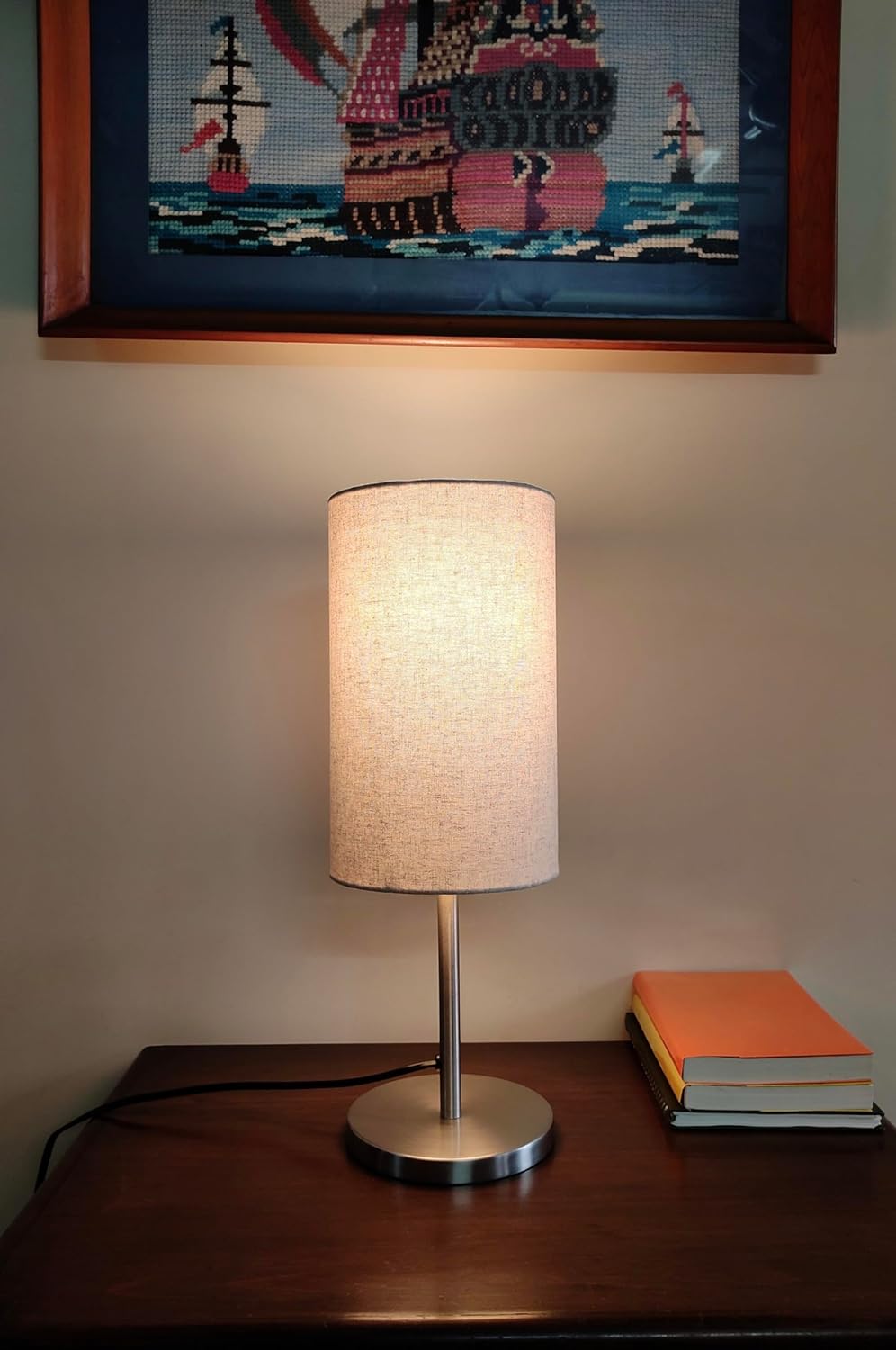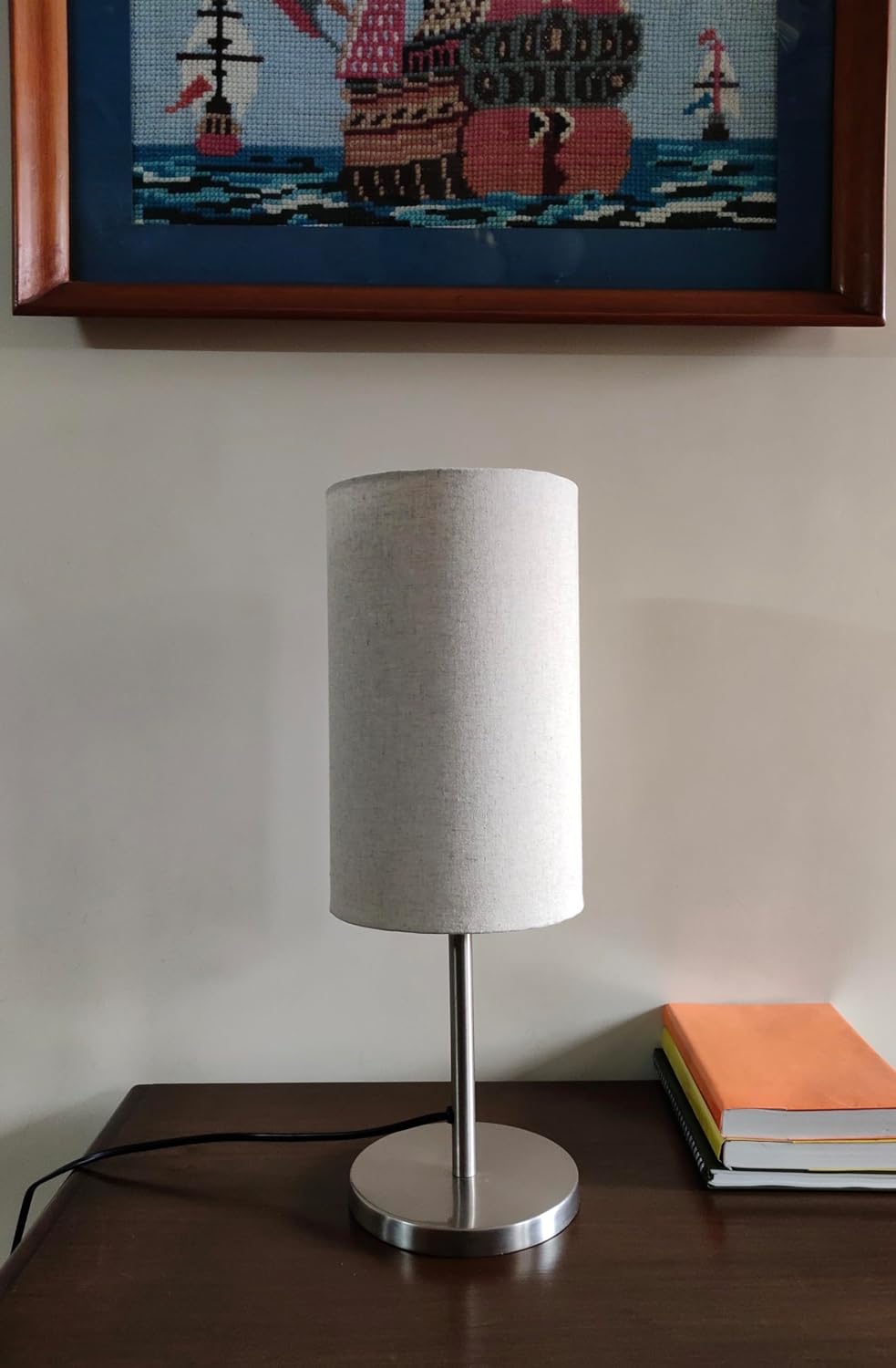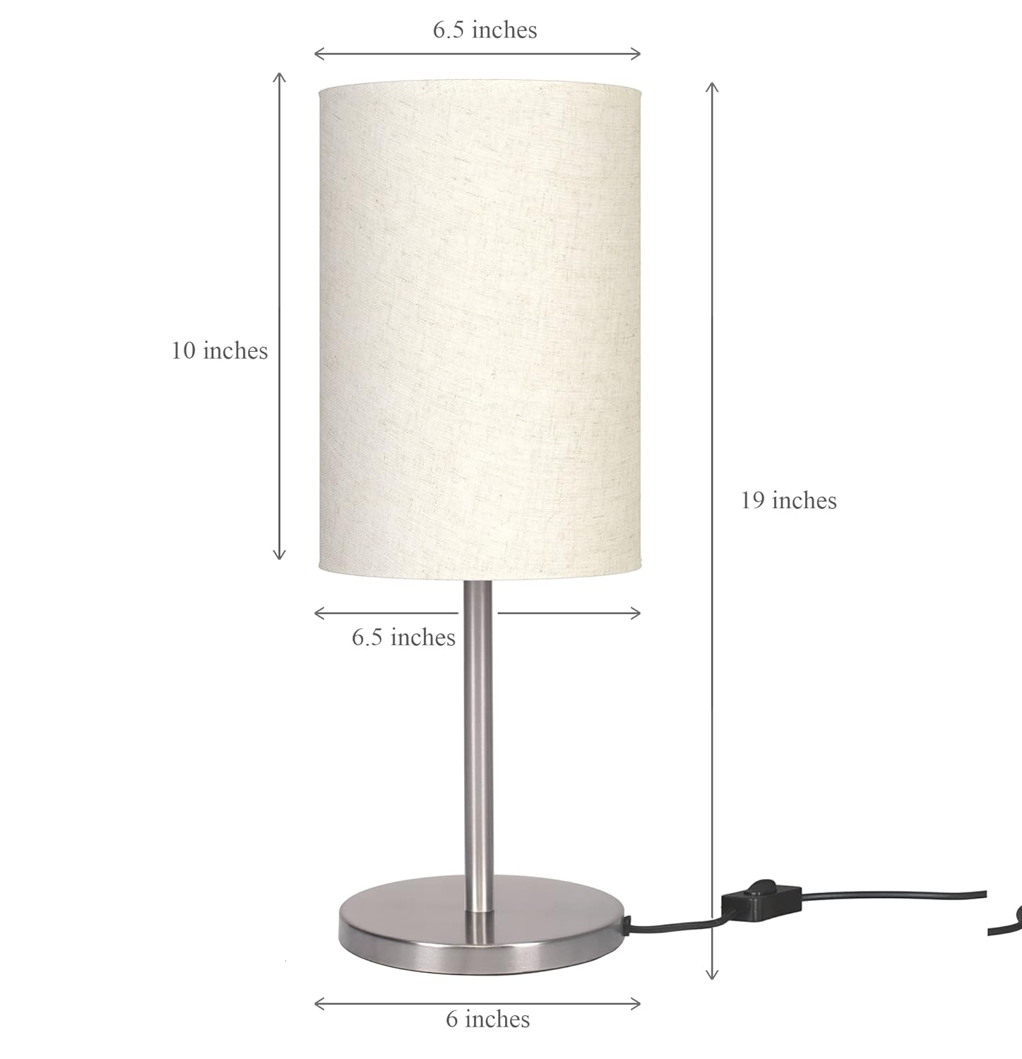 • Bedroom Table Lamp Sleek Silver 19 inches Height with Off White Cylinder Lampshade