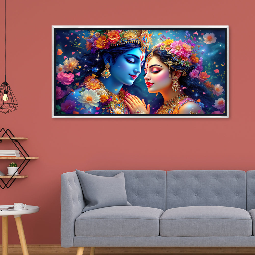 • Celestial Radha Krishna: Cosmic Love & Floral Galaxy Art – Modern Spiritual Wall Decor