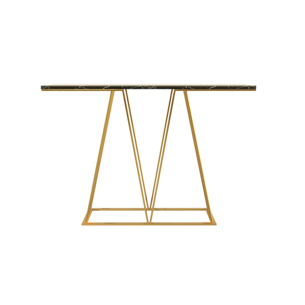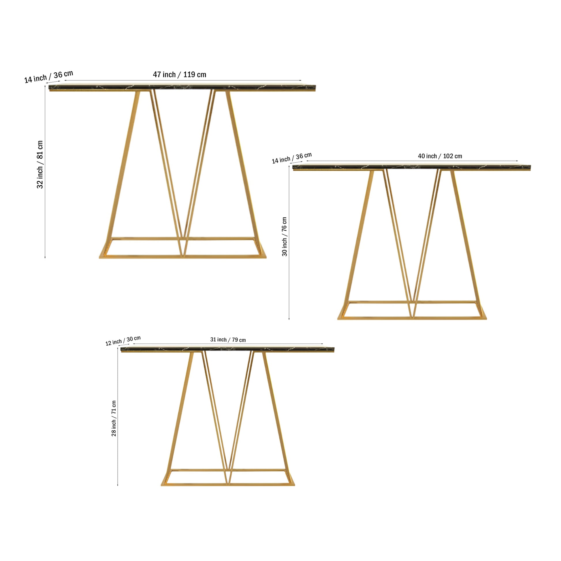 Elevate your space with the Designer Faux Black Marble V Shape Console Table, expertly crafted to combine style and functionality. Its sleek faux black marble top offers a sophisticated look without the maintenance of real stone, while the distinctive V-shaped base adds architectural interest and stability. Perfect for entryways or living rooms, this console table provides a stylish surface for décor or essentials, blending modern design with practical durability.