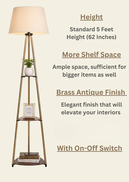 Divine Trends 3 Shelves Floor Lamp Brass Antique Finish 5 Feet Height with 16” Diameter Off White LampShade