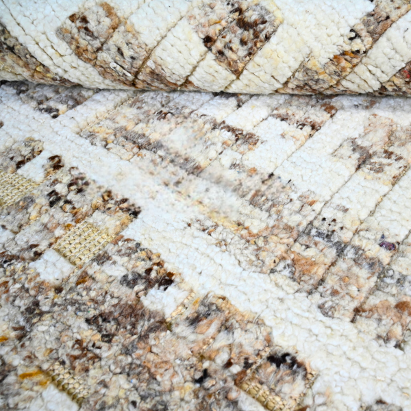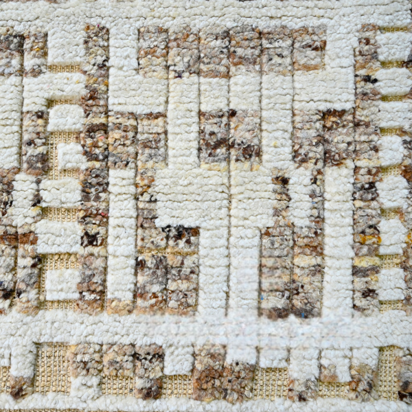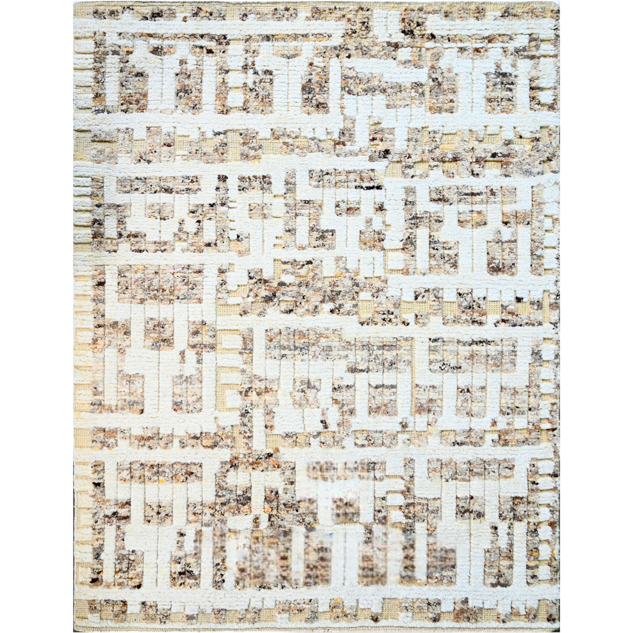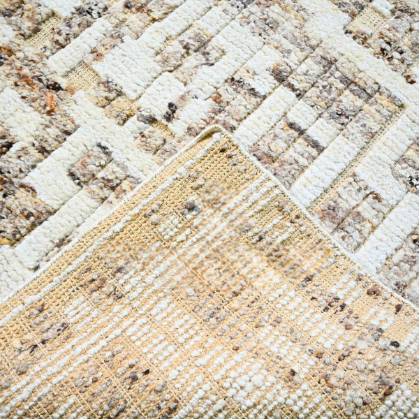 Elaris brings together organic texture and architectural elegance in a uniquely hand-knotted masterpiece. Crafted with a thoughtful blend of New Zealand wool, jute, and cotton, this rug features a tactile high-low surface where soft woolen ridges rise above a sturdy jute foundation. The intricate maze-like pattern and neutral color palette evoke balance and symmetry, making Elaris a refined choice for contemporary, rustic, or earthy interiors.