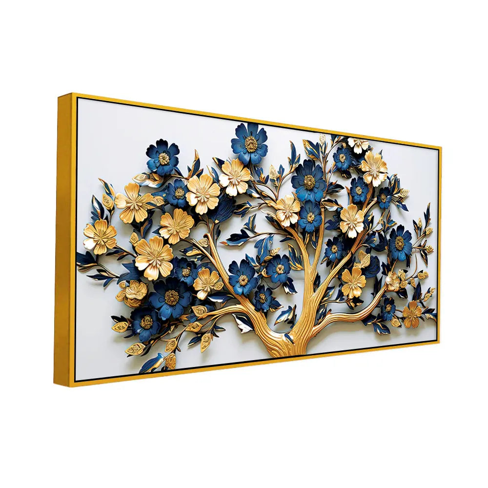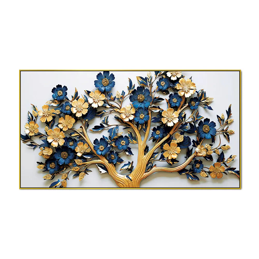 • Elegant 3D Floral Tree Wall Art – Gold and Navy Blue Blossoms on White Canvas