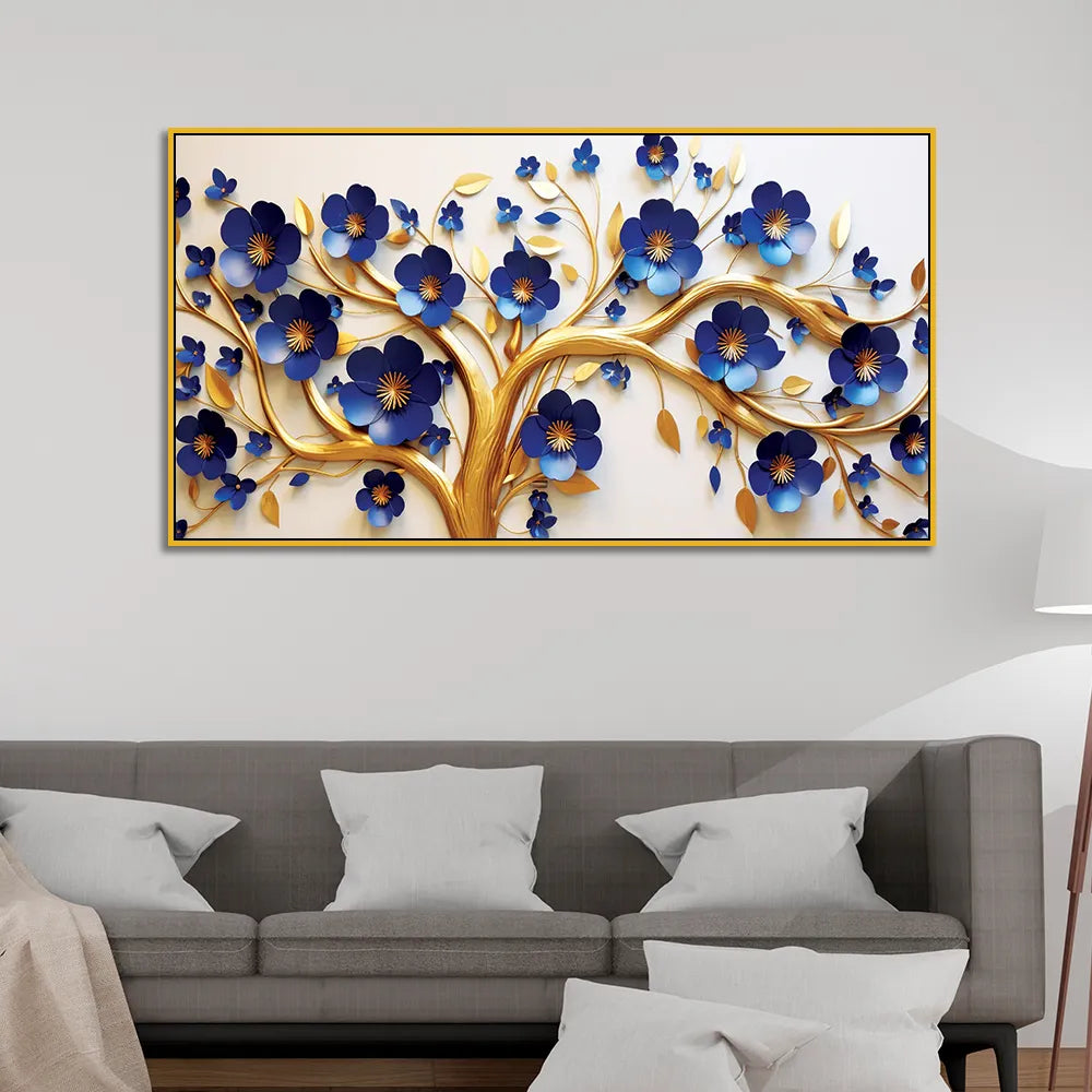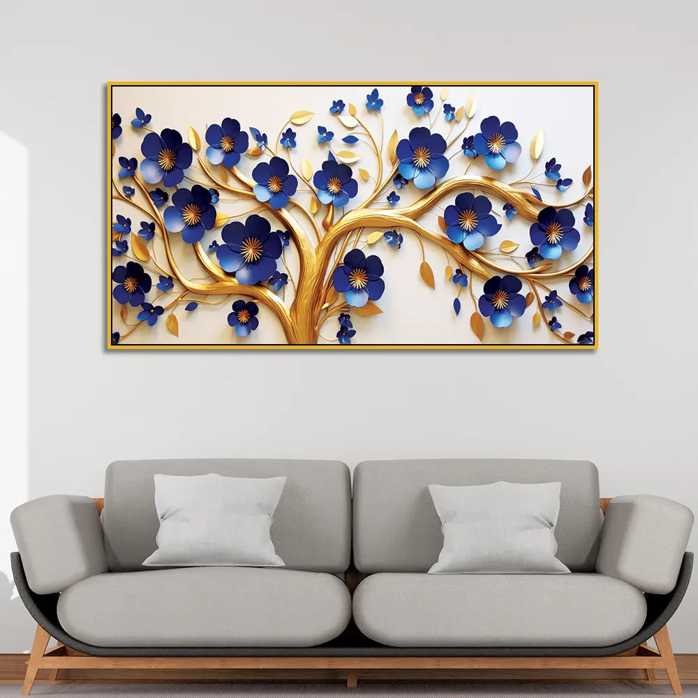• Elegant 3D Golden Tree Wall Art – Bold Blue Blossoms with Flowing Gold Branches