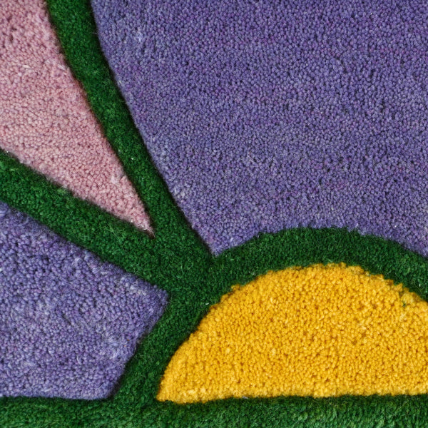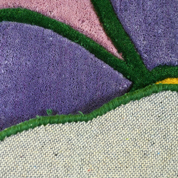 Delicate and dreamy, Floraya brings a soft burst of blooming charm to any child’s space. Hand-tufted in plush New Zealand wool, it features petal-like shapes in lavender and blush with a cheerful yellow center, all framed in a fresh green outline. The compact size and floral whimsy make it ideal for cozy corners, reading spots, or bedside styling.