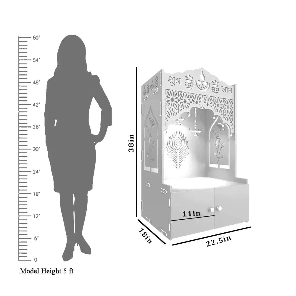 • Intricate Jali Wooden Floor Temple with Spacious Shelf & Inbuilt Focus Light- White | Abstract Golden Plant Leaves Picture Acrylic Wall Paintings & Arts