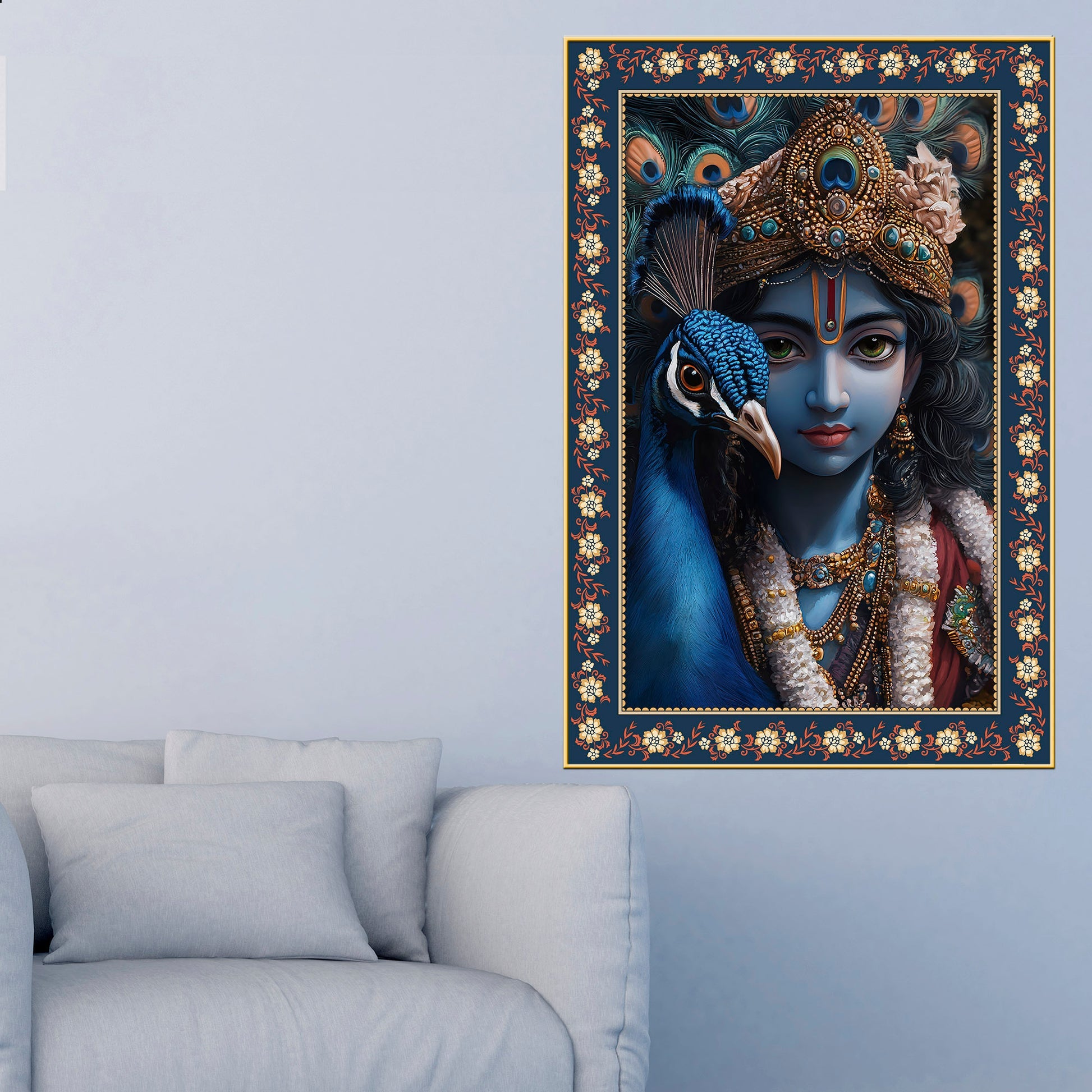 Krishna Grace Feathered Friend Floral Border Vertical Wall Painting