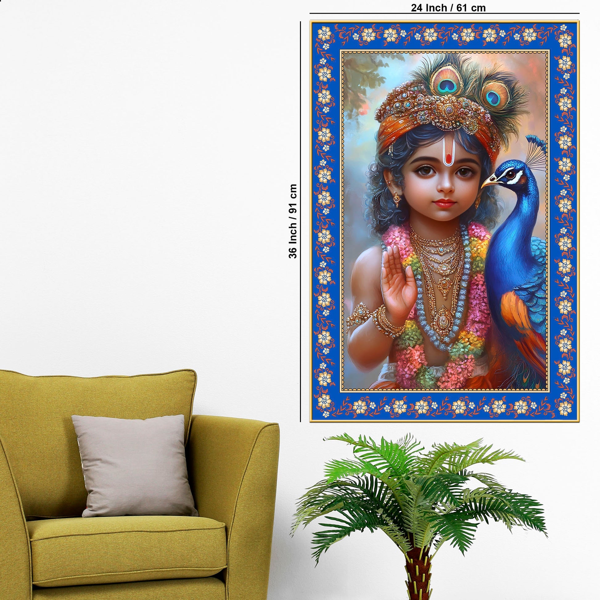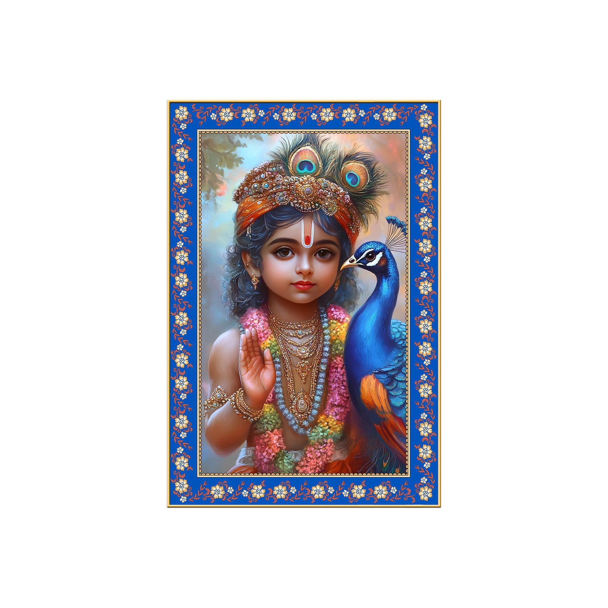 • Little Krishna with Peacock Floral Border Vertical Wall Painting