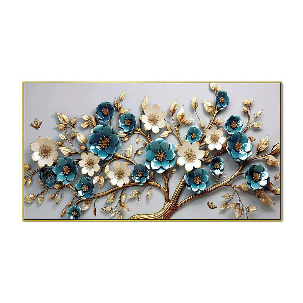 • Luxurious 3D Floral Tree Wall Art – Teal and White Blossoms with Gold Detailing for Elegant Interior Décor