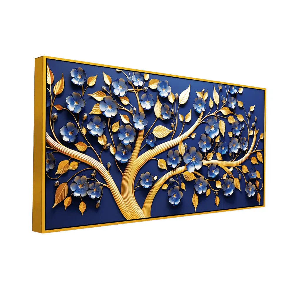 • Luxury 3D Golden Tree Wall Art – Blue Floral Blossoms with Golden Leaves on Deep Navy Background