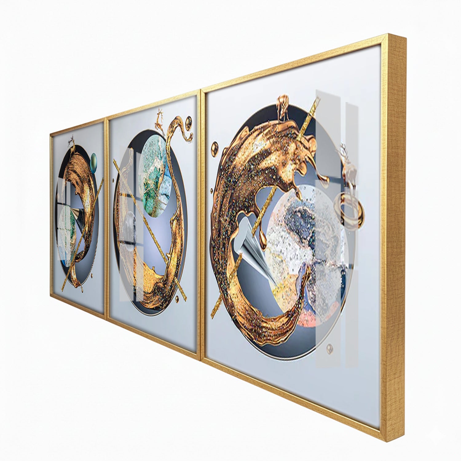 • Luxury  Abstract Wall Art: Gold Splash & Cosmic Spheres Triptych (Set of 3)