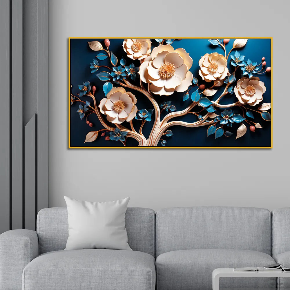 Luxury Floral Wall Art – 3D Gold and Blue Blossom Tree on Deep Blue Canvas