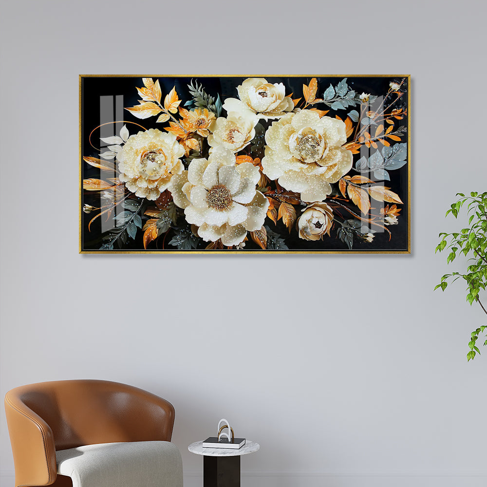 Luxury White and Gold Textured Floral Acrylic Wall Art on Black Background