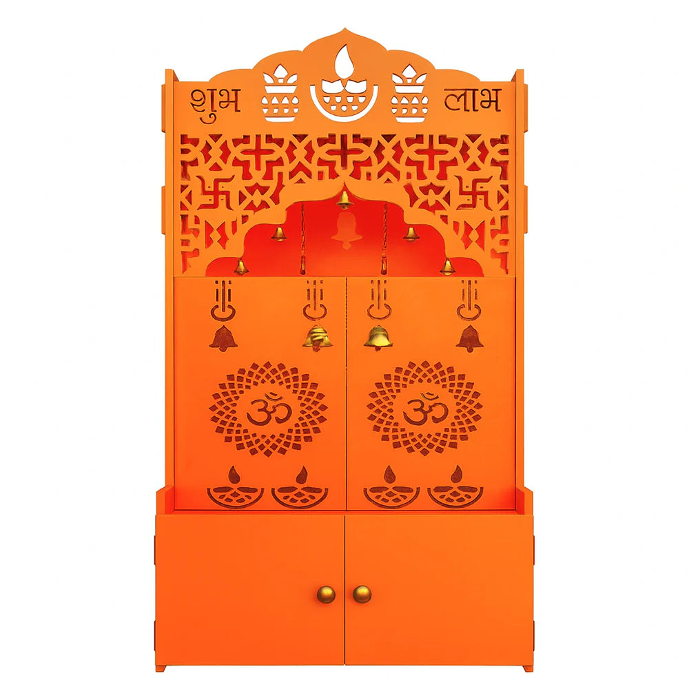 Modern Bhagwa Wooden Floor Pooja Mandir with Doors Laser-Cut Om & Diya Design with Storage Cabinet