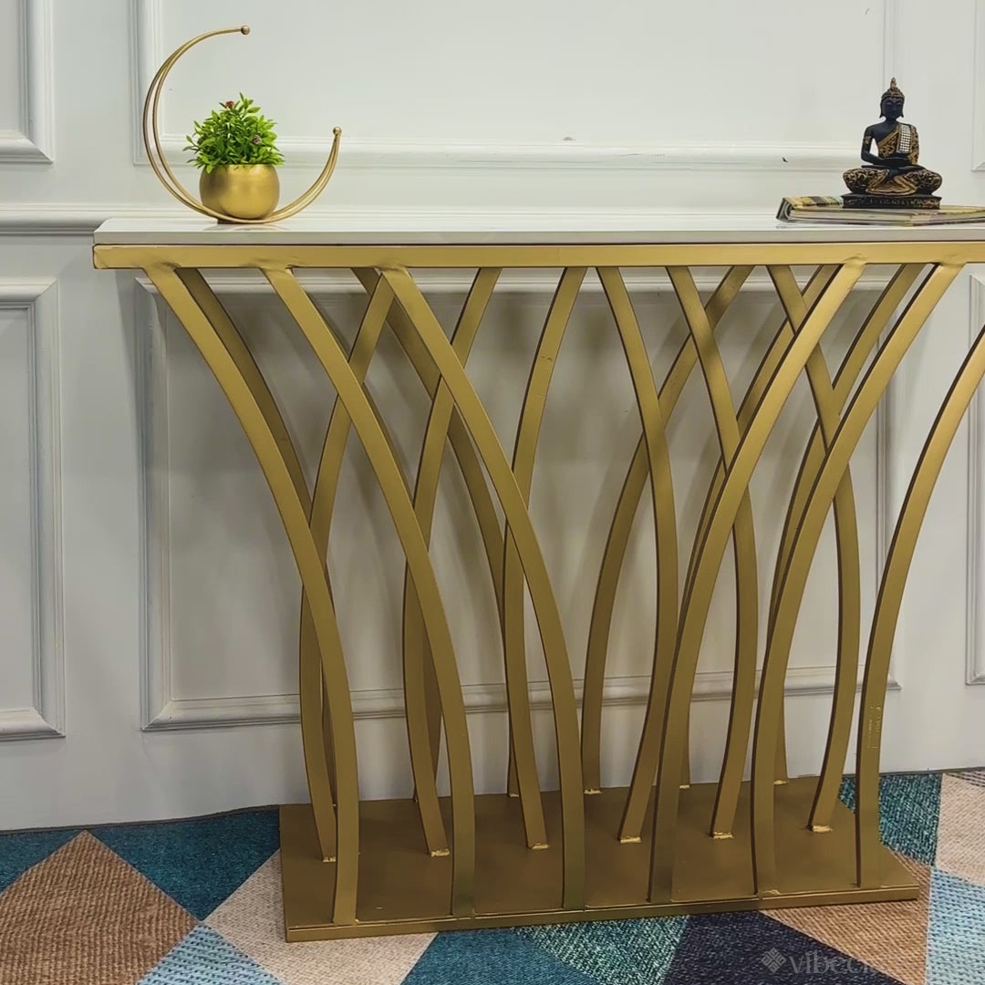 Elevate your living space with this Modern Glam Console Table featuring a striking designer gold base. Crafted to blend contemporary style with luxury, it offers both aesthetic appeal and functional surface area for display or storage. The sturdy gold base ensures durability while adding a sophisticated touch to any room. Perfect for entryways or living rooms, this console table balances form and function in a refined, expert design.