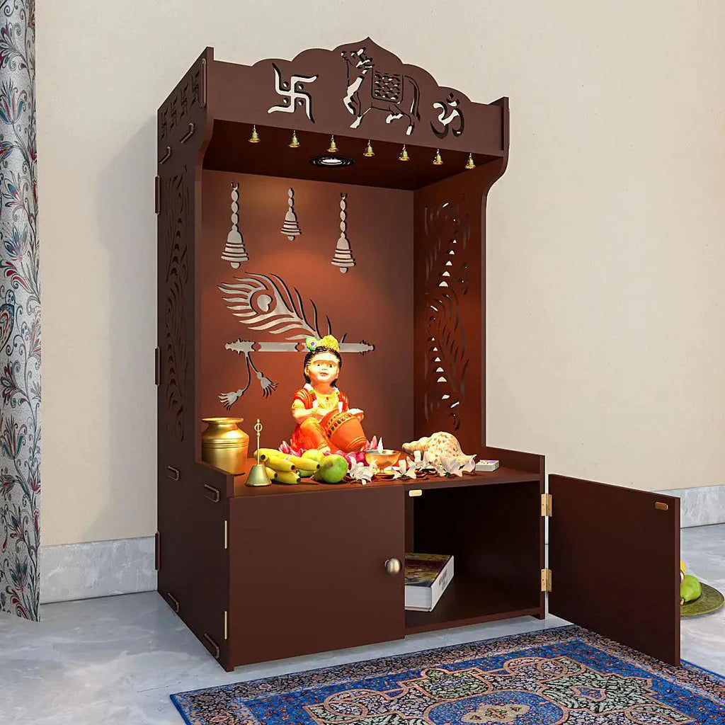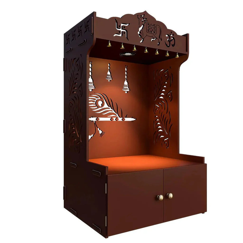 • Mor Pankh Wooden Floor Temple With Spacious Shelf & Inbuilt Focus Light- Brown