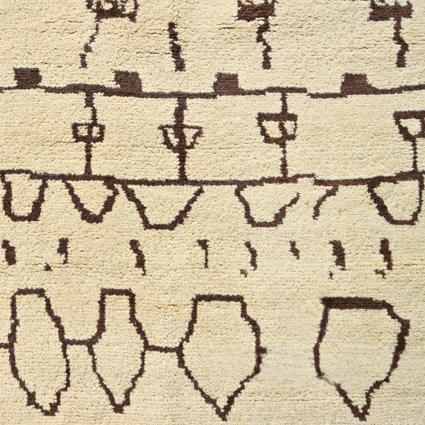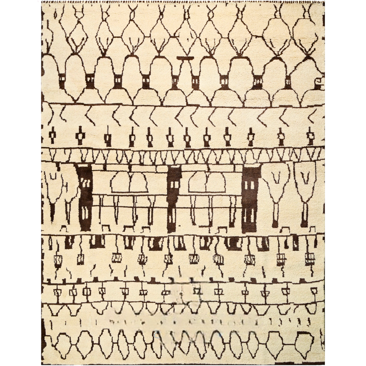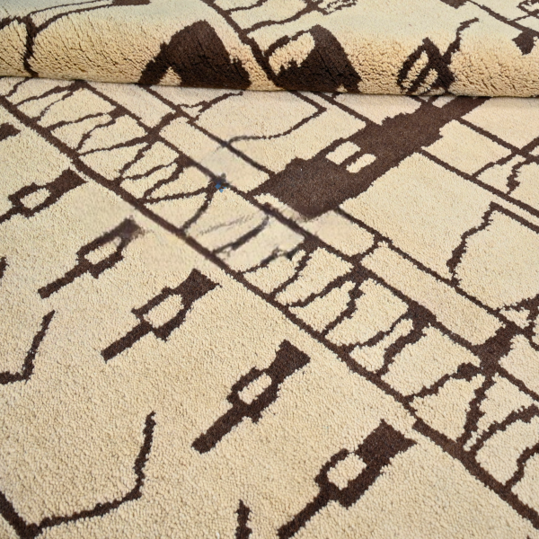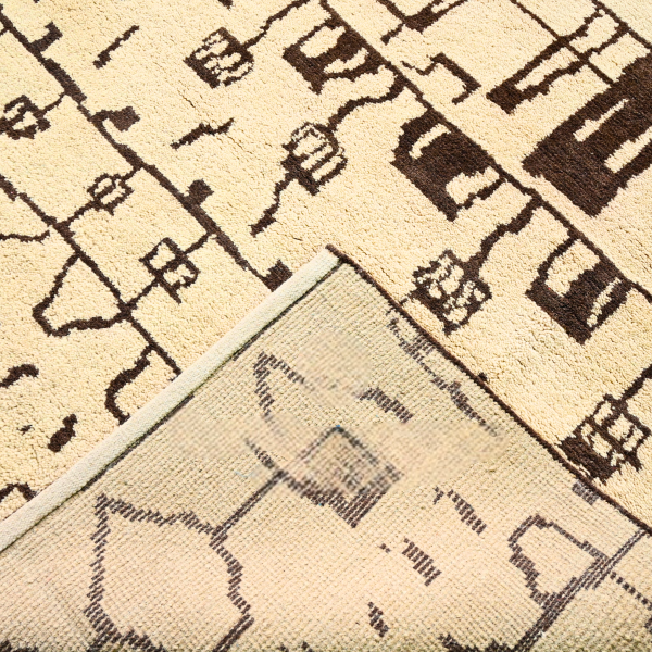 Olyra brings the soul of Moroccan tradition into contemporary spaces. Hand-knotted in plush wool, its tribal motifs echo ancient Berber storytelling with a modern graphic rhythm. The natural ivory field contrasts beautifully with bold brown patterning, offering warmth, texture, and cultural richness. Customizable in size, color, and design for homes that celebrate artisanal heritage.