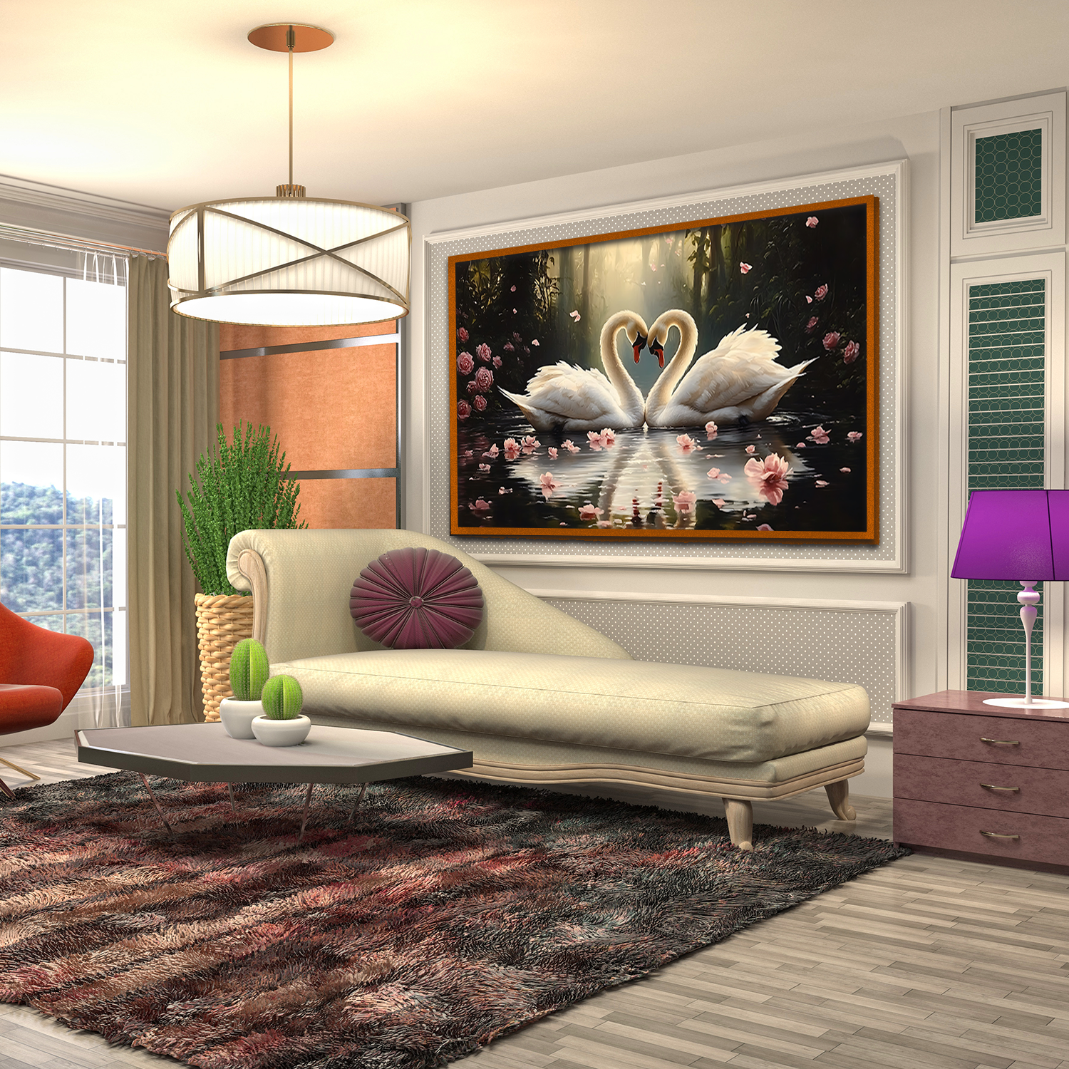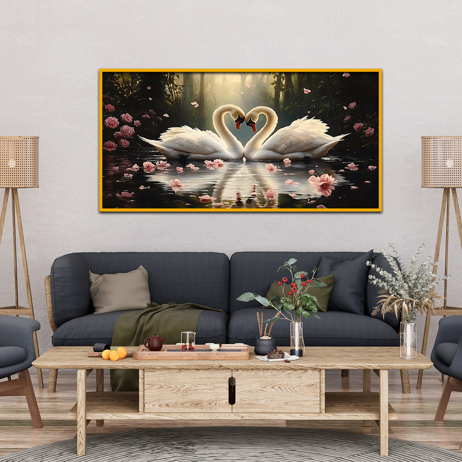 • Painting Two Swans Making Heart Shape Pond Water Canvas Wall Paintings