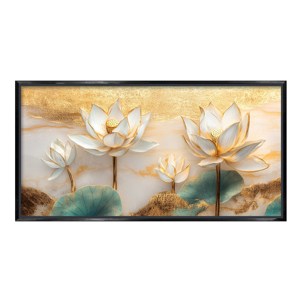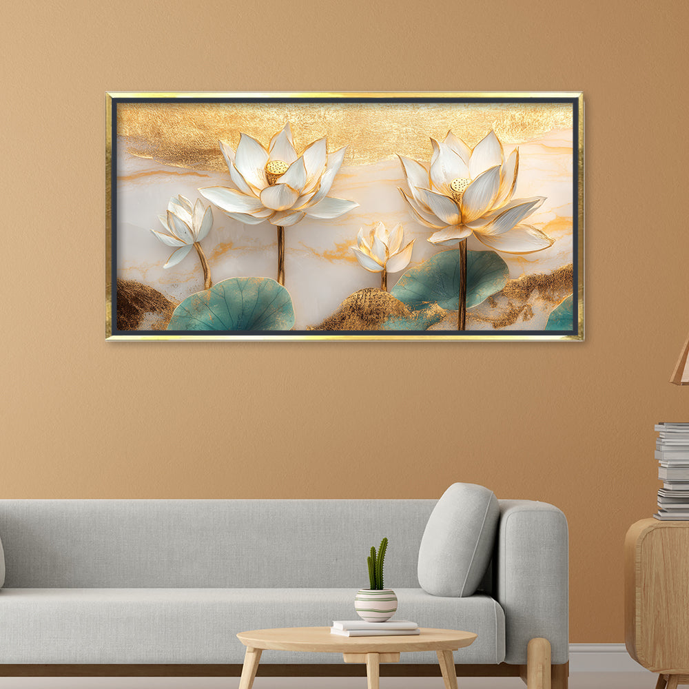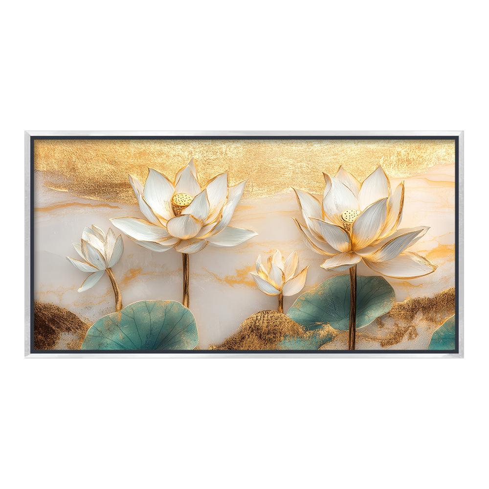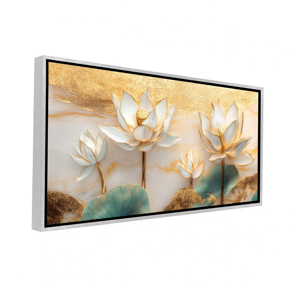 Premium 3D White Lotus Flower Wall Art | Gold Accented Floral Canvas Print