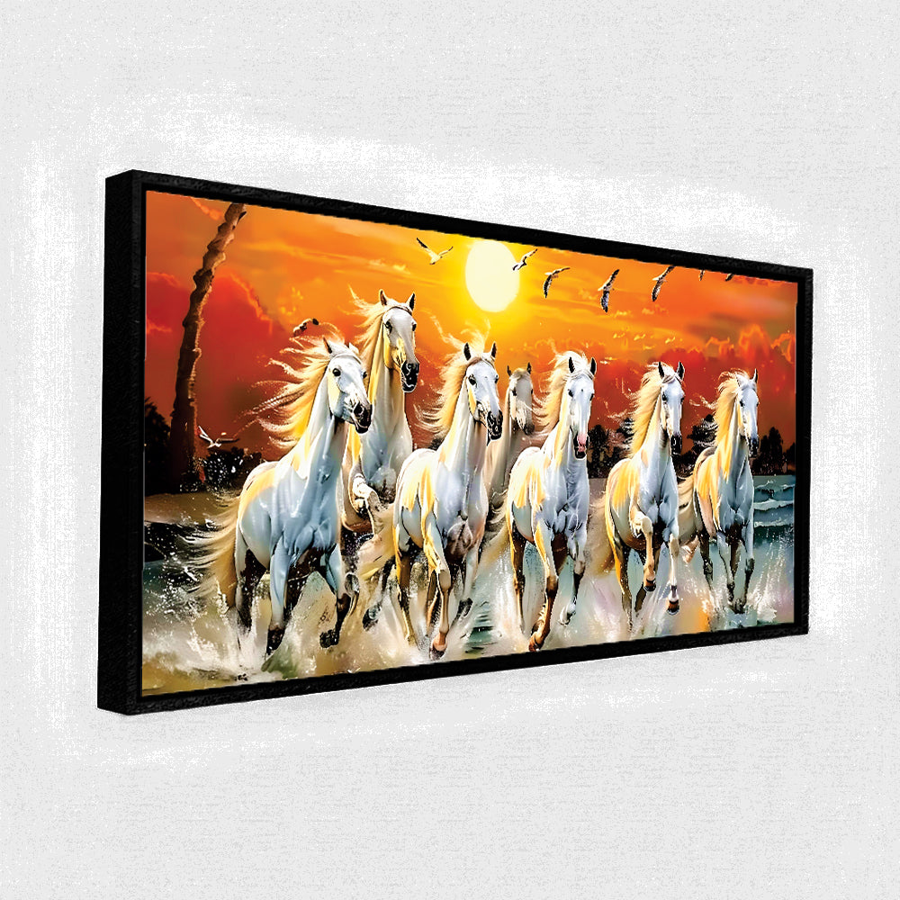 • Premium 7 Running Horses at Sunrise Vastu Canvas Wall Painting with Floating Frame