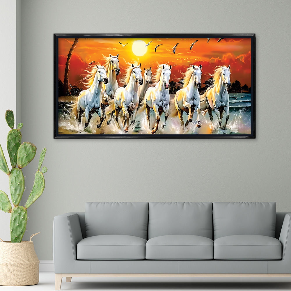Premium 7 Running Horses at Sunrise Vastu Canvas Wall Painting with Floating Frame