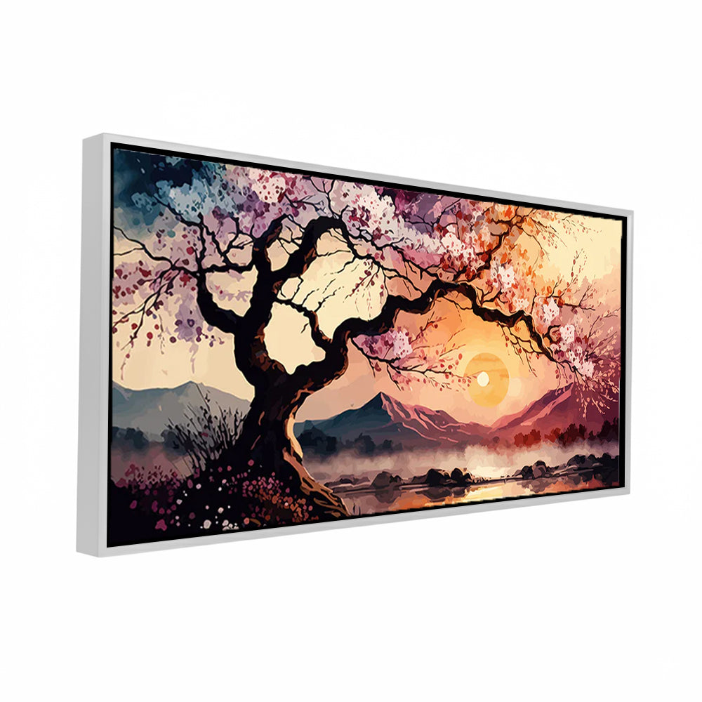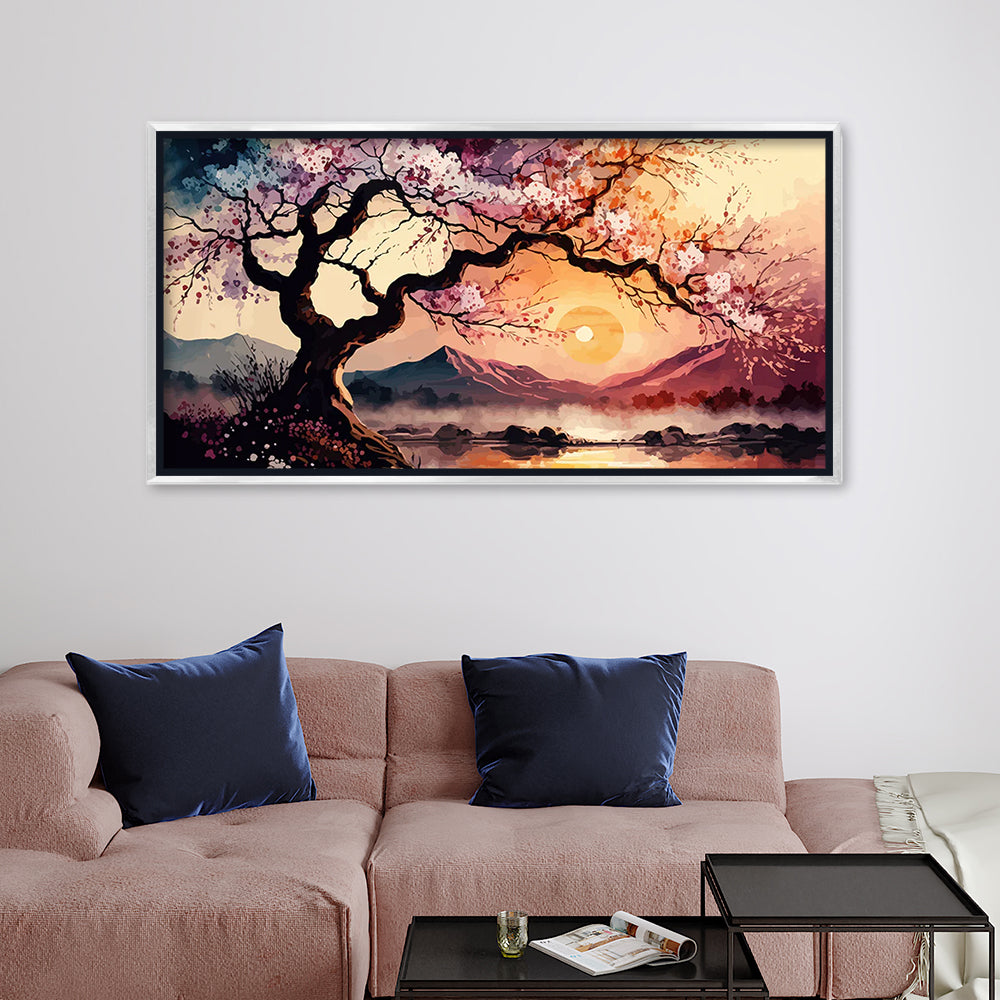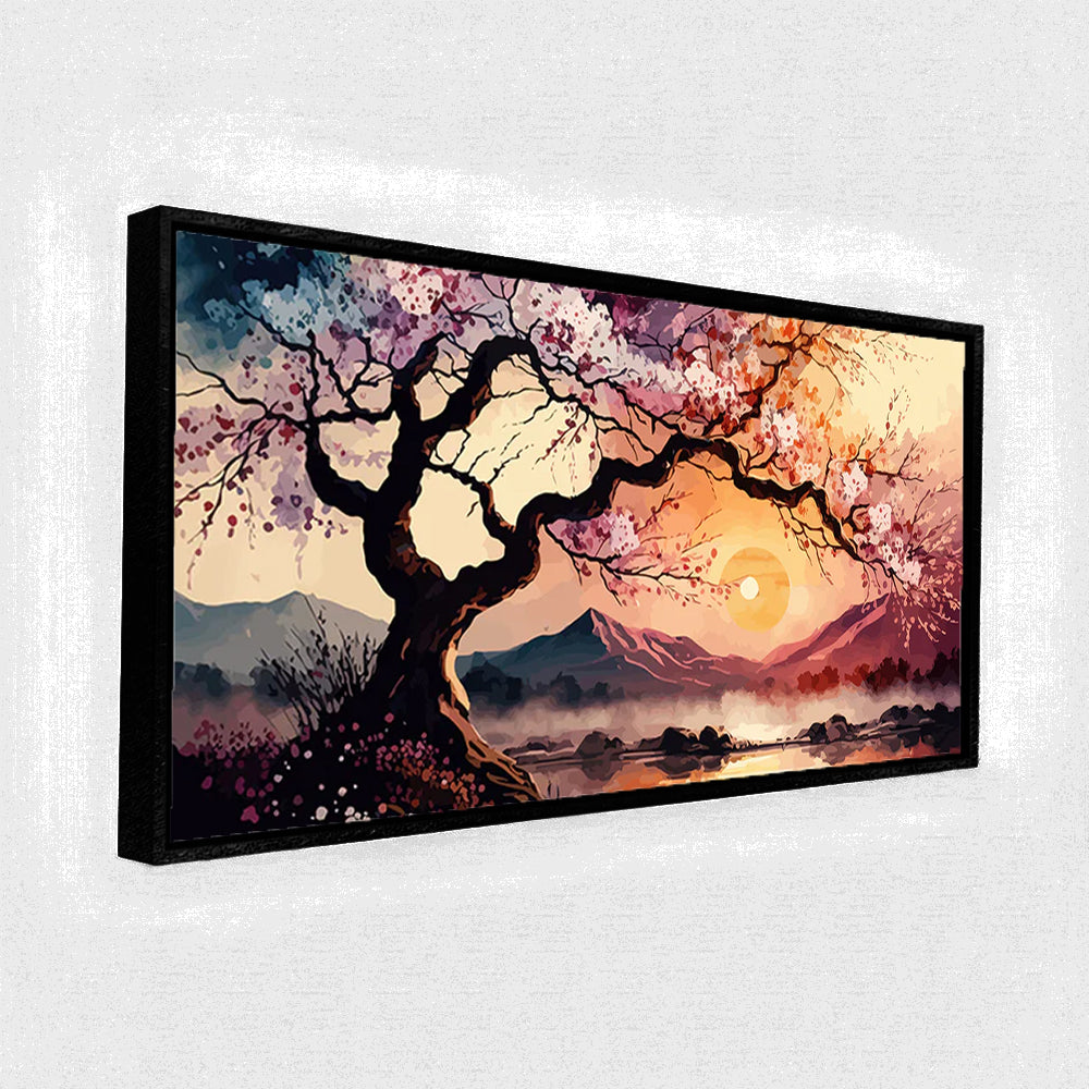 Premium Cherry Blossom Tree Sunset Canvas Art | Tranquil Asian Landscape Painting