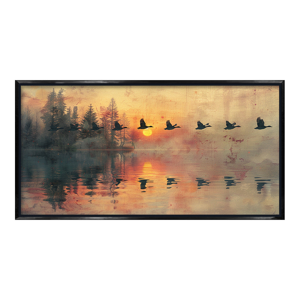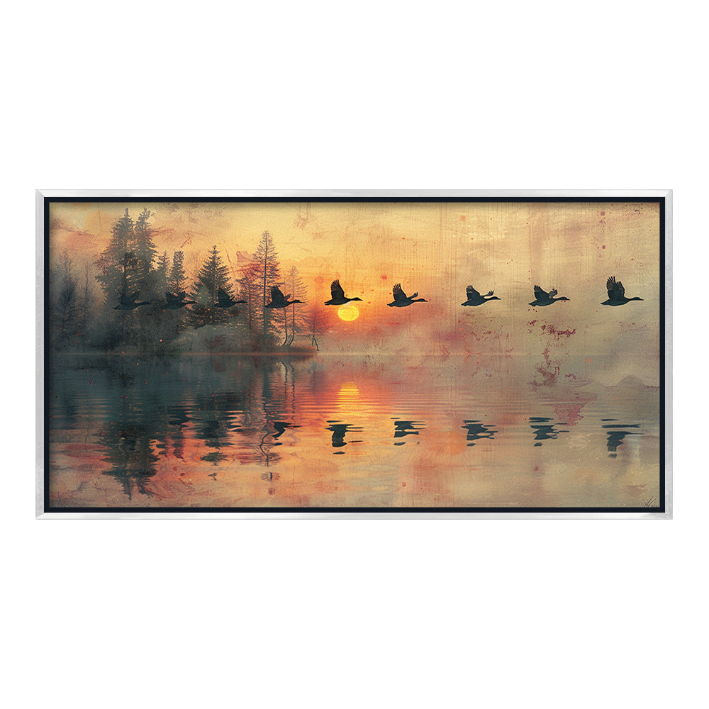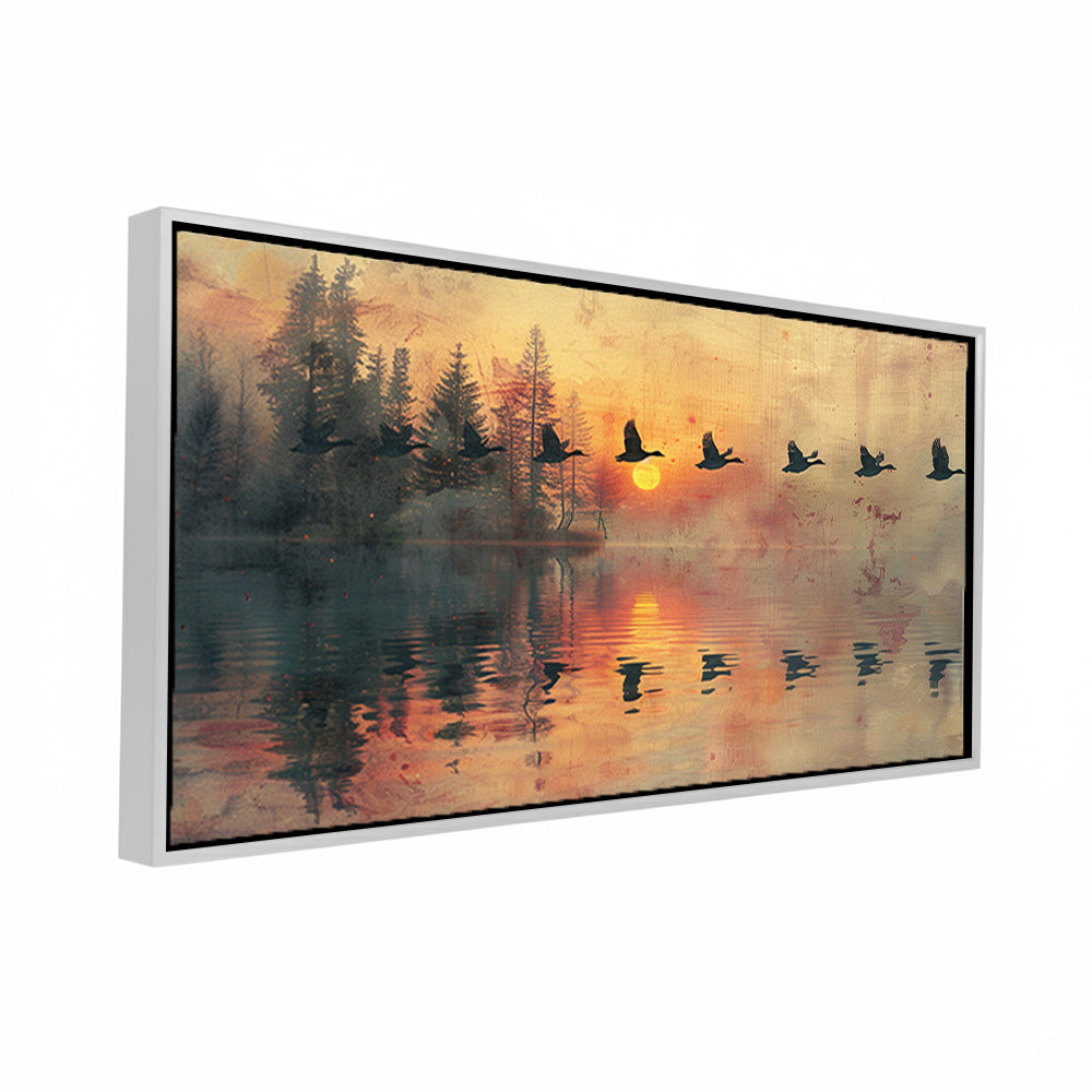 • Premium Geese Flying at Sunset Canvas Art | Tranquil Lake Reflection Painting