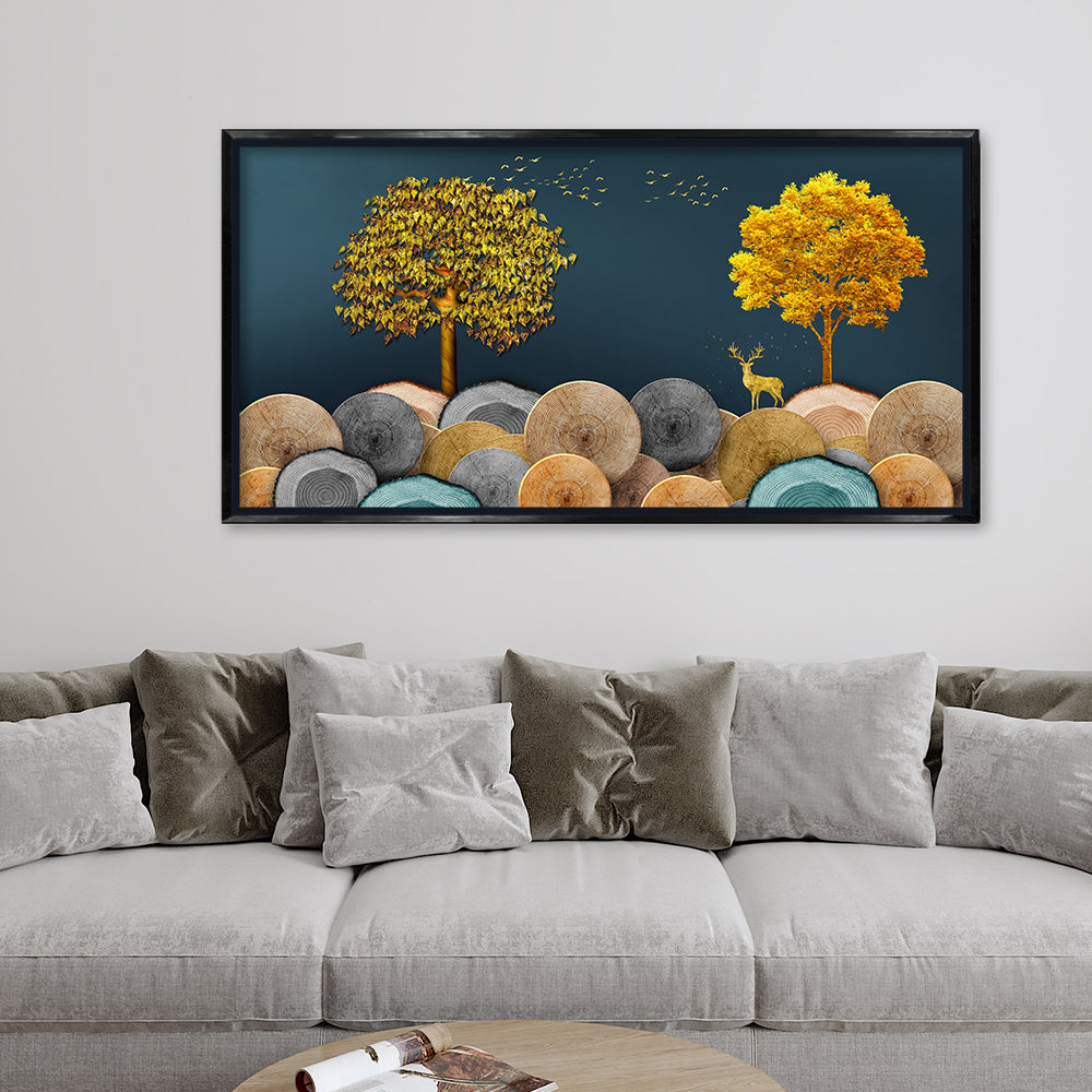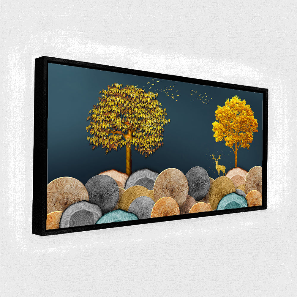 Premium Luxury Golden Tree Deer Wall Art Print | Modern Abstract Log Texture Landscape Canvas