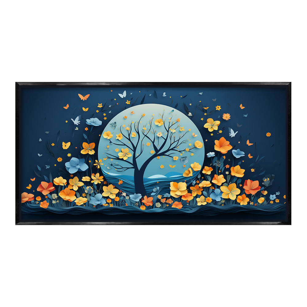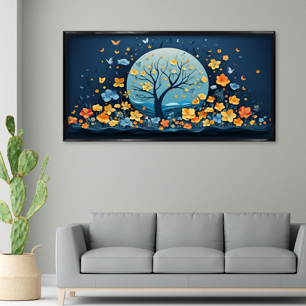 Premium Night Flower Tree Canvas Art | Blue and Orange Floral Moon Print