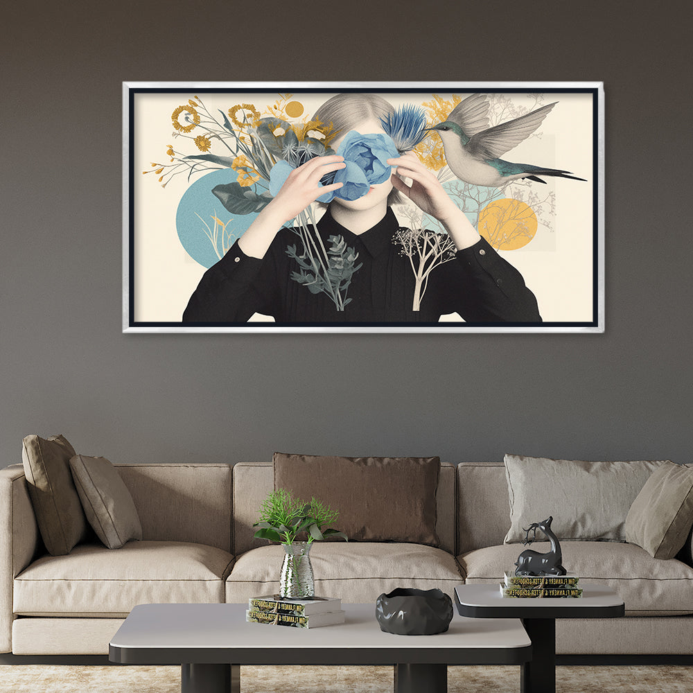 • Premium Surreal Woman and Flower Canvas Art | Hummingbird and Botanical Collage Print