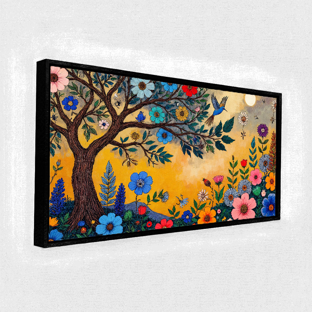 premium Whimsical Flower Garden Canvas Art | Vibrant Folk Art Tree Painting