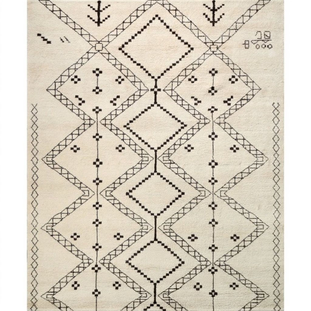 Tavira is a hand-knotted expression of tribal artistry and natural elegance. Crafted from 100% premium New Zealand wool, it features bold diamond motifs in rich brown tones set against a soft ivory ground. The thick pile and rustic charm make Tavira ideal for bohemian, transitional, or earthy interiors seeking depth, comfort, and quiet character.