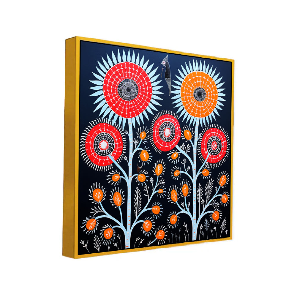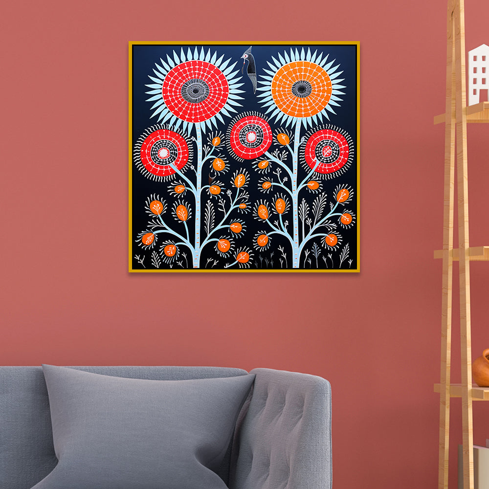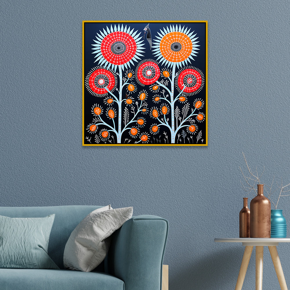 Tribal Bloom Gond Art Floral Canvas Wall Painting