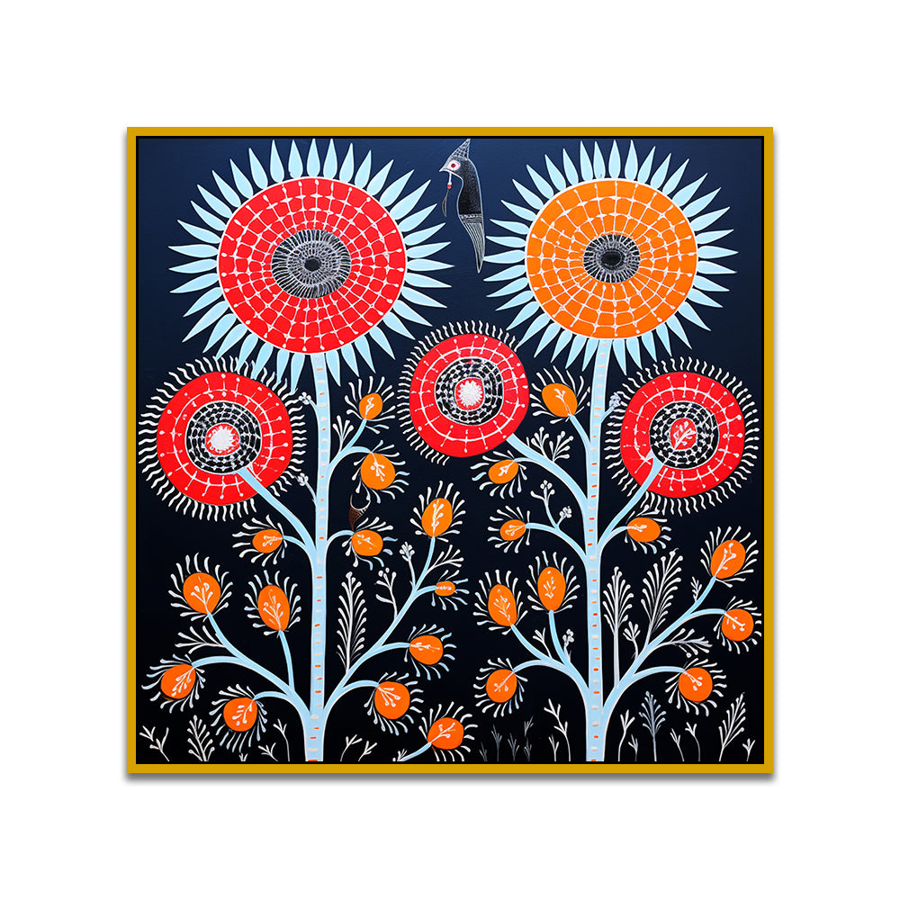 • Tribal Bloom Gond Art Floral Canvas Wall Painting