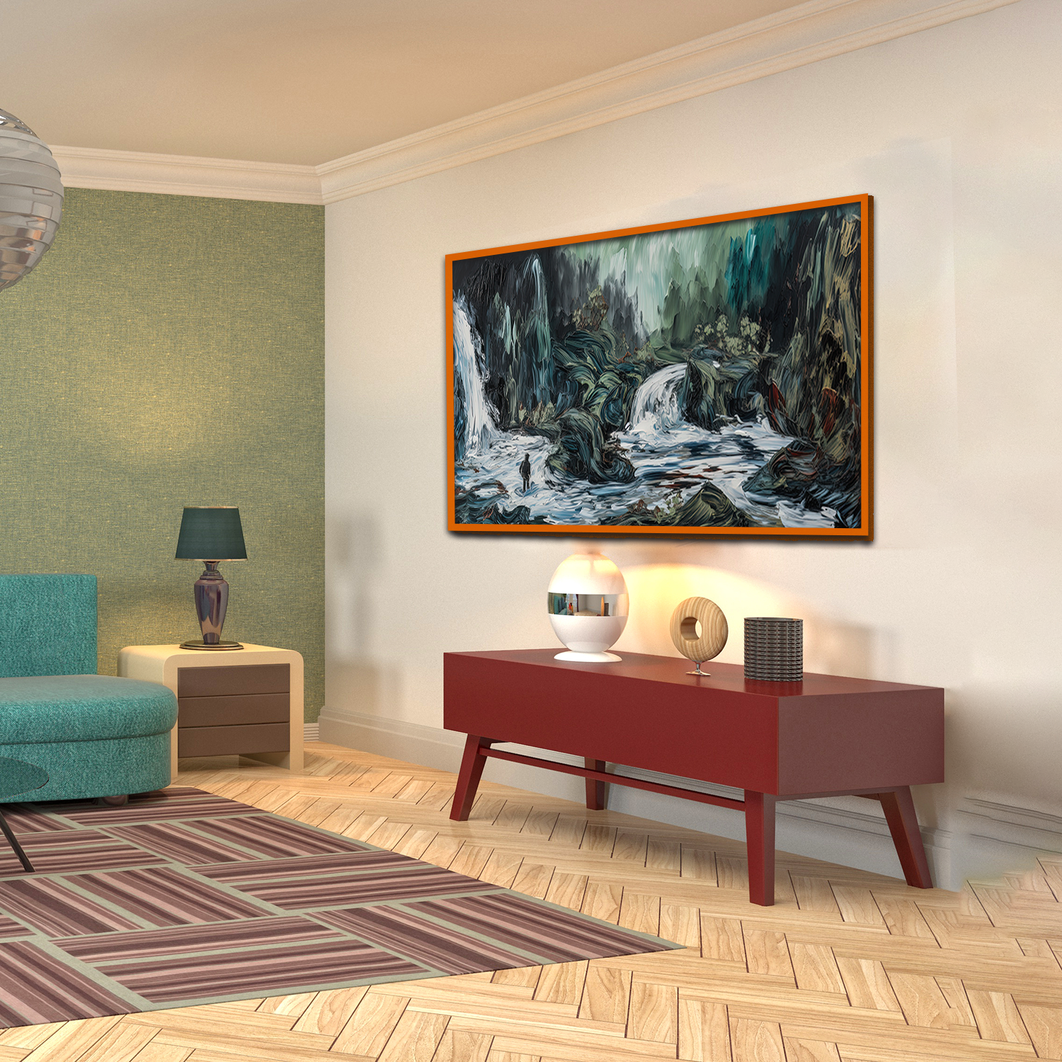 • Beautiful Waterfall with Green Background Black White Painting Waterfall Canvas Wall Paintings